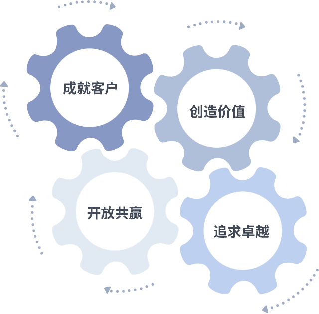 成就客户是一切决策的出发点,,创造价值是衡量所有工作的标准,,,追求卓越是我们做事做人的态度,,,,开放共赢是我们的格局也是最终的结果。。。价值观的齿轮环环相扣,,,,推动着组织里的每个人不断向前。。。。